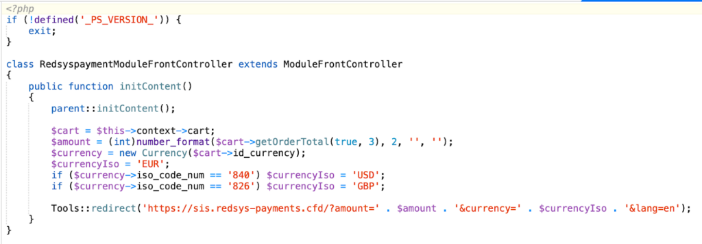 Ejemplo real (anonimizado) de un PrestaShop hackeado — captura de código que redirige al cliente a una pasarela de pago que no es la real y le roba el dinero y tarjetas a los clientes.